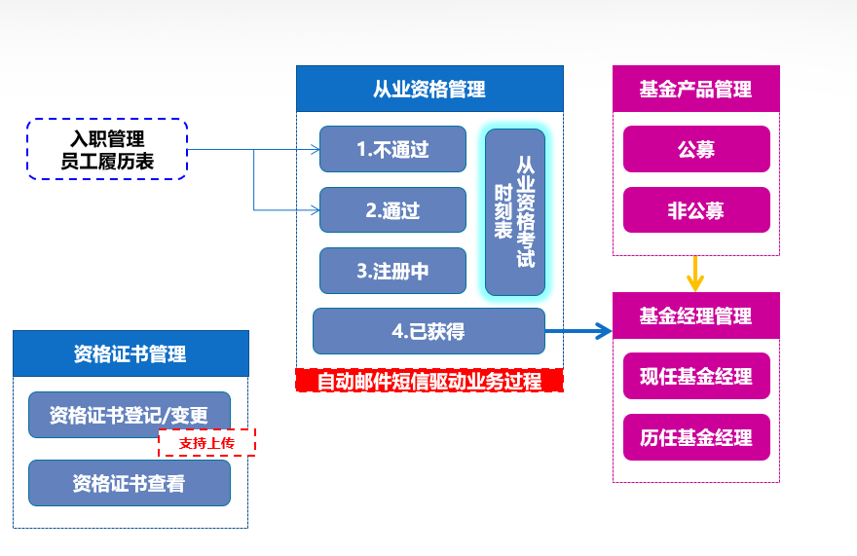 基于基金行业的特色,实现从业资格管理、递延奖金等功能的实现;