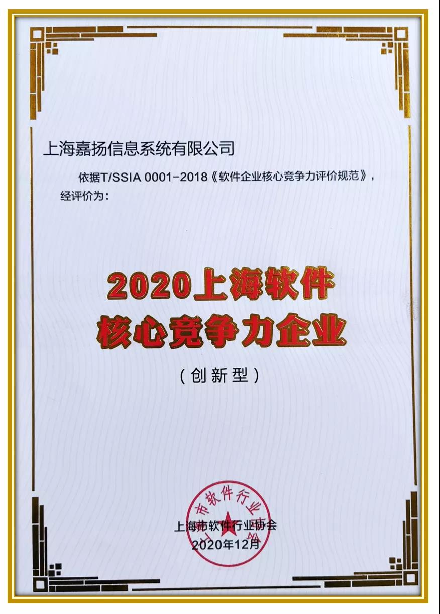 在后疫情时代背景下,为鼓励软件企业在疫情期间的积极贡献,加强软件企业竞争力宣传力度,打造“上海服务”品牌,进一步促进软件产业实现更快发展,结合上海市软件行业实际情况,上海市软件行业协会开展了“2020年上海市软件企业核心竞争力评价”工作。在此次评选中,嘉扬凭借领先的科技创新实力与稳健发展的市场步伐,荣获“2020上海软件核心竞争力企业”荣誉称号。