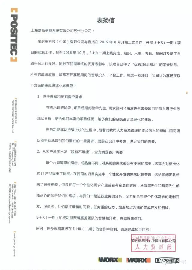 继国内规模最大的现代化阀控密封蓄电池生产制造企业:南都电源动力股份有限公司发来的表扬信之后,中国民企标杆,在世界电动工具市场占有重要地位的宝时得科技(中国)有限公司发来表扬信,对嘉扬“宝时得项目团队”在细分用户需求调研,满足用户个性化需求,随时随地站在用户角度考虑问题、解决问题的工作态度和对整个项目顺利上线使用所付出的努力表示赞许与感谢!同时也预祝接下来与嘉扬合作的项目二期能够顺利、圆满!