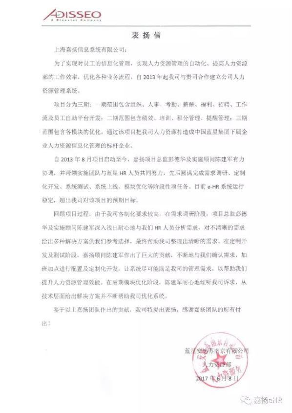 6月8日,蓝星安迪苏南京有限公司向苏州嘉扬云信息科技有限公司发来表扬信,对苏州嘉扬实施团队在蓝星安迪苏e-HR项目中所做的努力和取得的成果表示高度认可与感谢!