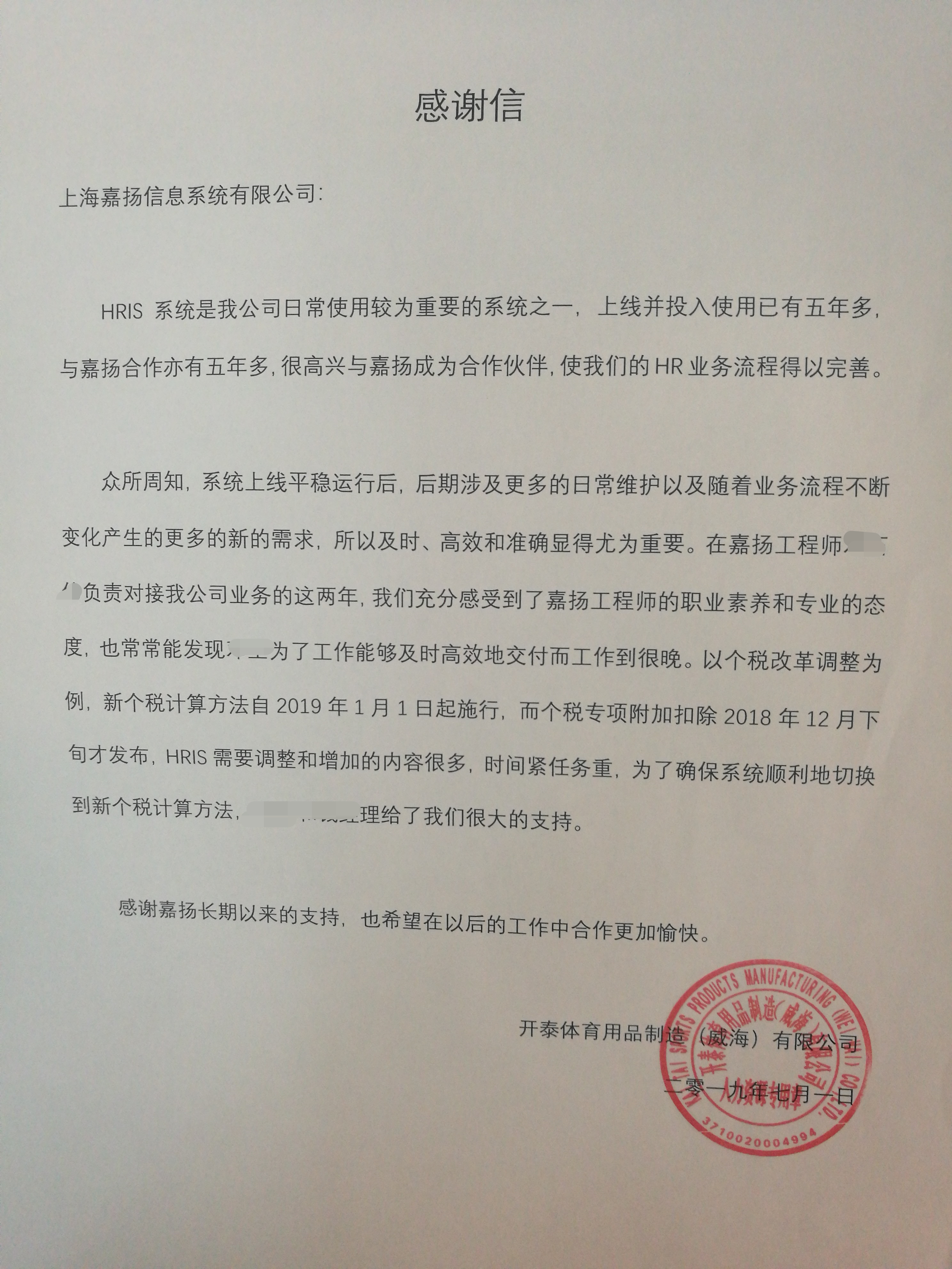 近日,嘉扬收到一封老客户——开泰体育用品寄来的感谢信:对嘉扬五年以来的优质的系统维护以及高效的需求响应速度表示感谢,对嘉扬维护工程师的专业与敬业表示肯定与赞许。