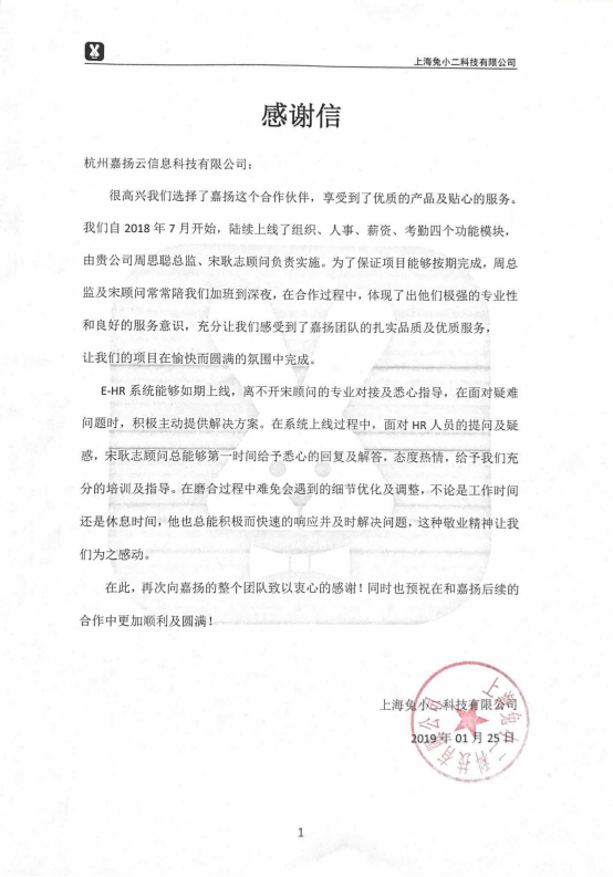 近日,嘉扬杭州分公司,杭州嘉扬云信息科技有限公司又收到一封来自兔小二科技发来的感谢信,他们非常高兴选择了嘉扬这样一家合作伙伴,让他们能够享受到优质的产品与贴心的服务。