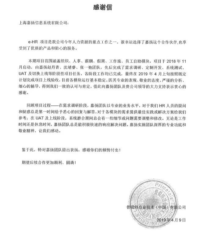 近日,嘉扬实施部项目团队收到一封来自普锐特冶金技术(中国)有限公司发来的感谢信。对嘉扬提供的优质产品与贴心服务表示肯定与感谢!普锐特项目启动于2018年11月,本期项目涵盖组织管理,人事信息管理,薪酬,福利,假期工作流,员工自助。并在2019年4月上旬按照既定计划完成了项目验收并运行稳定。
