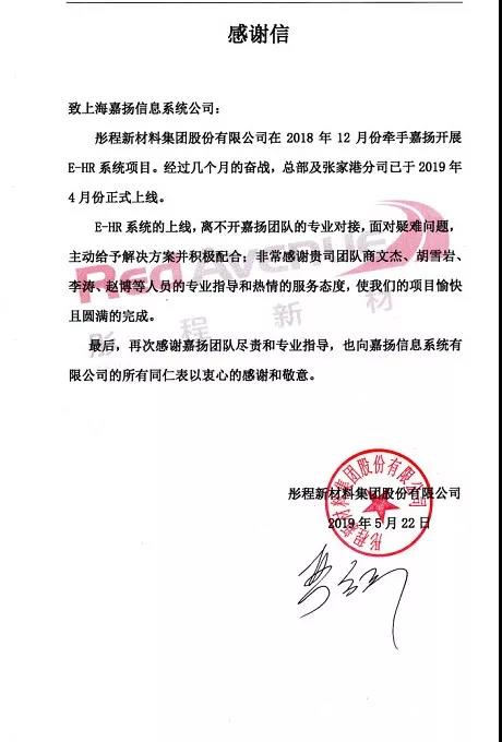 2019年5月22日,嘉扬实施团队收到一封来自彤程新材料集团股份有限公司的感谢信,感谢嘉扬实施团队对彤程eHR项目的专业指导与实施,并对嘉扬团队的专业与尽责表示肯定与赞许。彤程集团e-HR项目始于2018年12月,2019年4月彤程集团总部及张家港分公司成功上线交付。