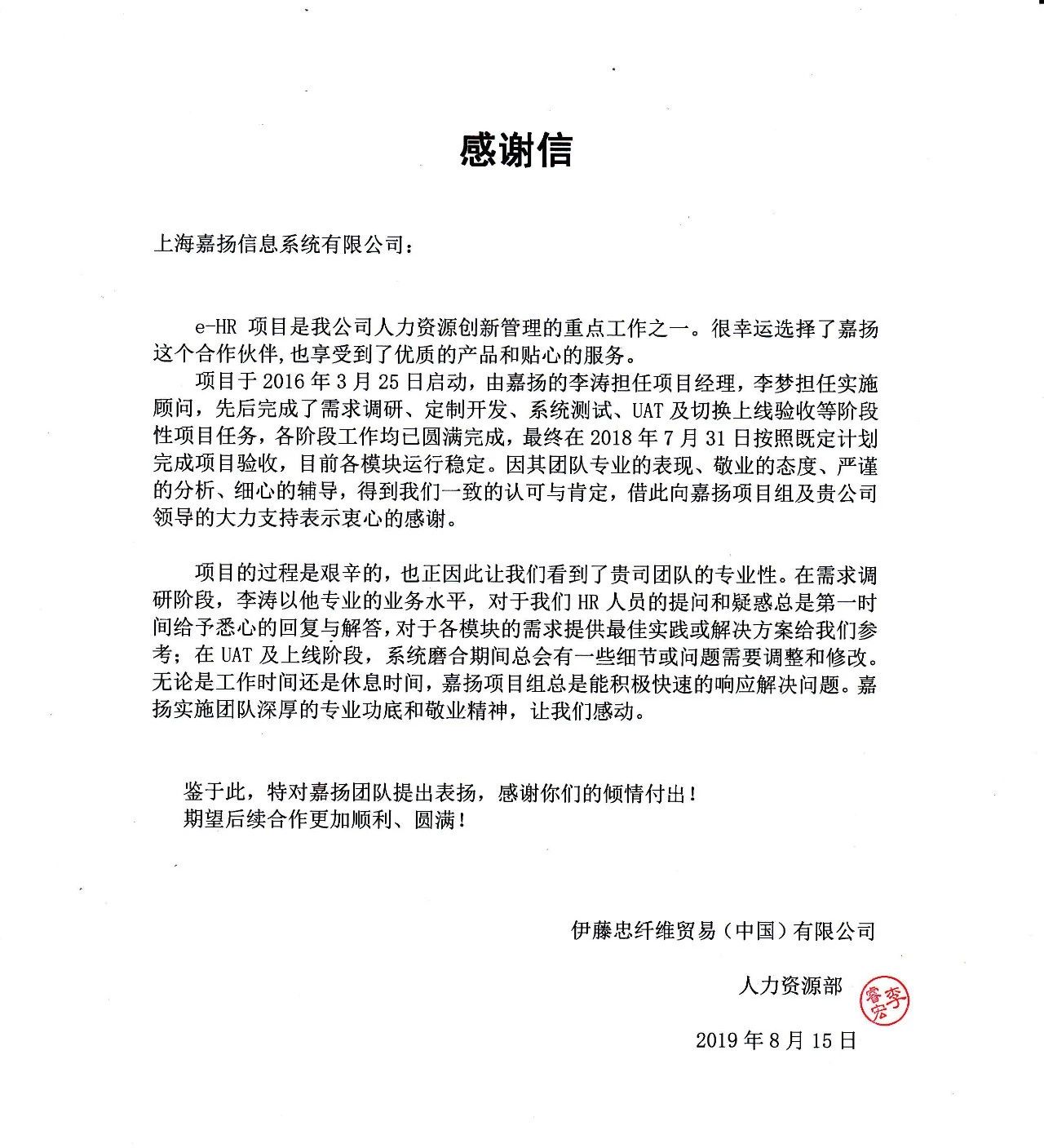 伊藤忠(中国)项目涉及7大区域的分子公司,业务范围涵盖人力资源管理六大???,外加员工自助、工作流、自动邮件,以及外部接口。对此,嘉扬在对伊藤忠e-HR项目进行详细的需求调研的基础上对项目进行了切实可行的项目分期,并于2018年7月成功交付。经过一年的使用,目前各模块运行稳定。为此,伊藤忠特此发来感谢信,对嘉扬团队的专业的表现、敬业的态度、严谨的分析、细心的辅导表示衷心的感谢。