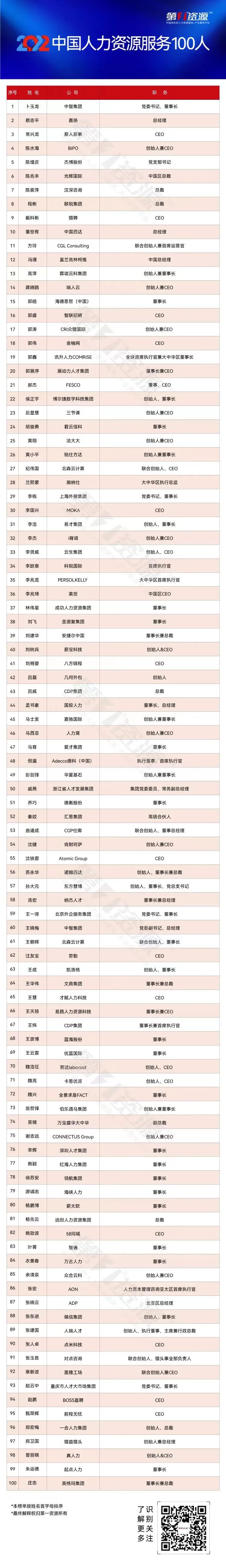 近日,人力资源行业内领先的第三方媒体——第一资源重磅发布了“2022中国人力资源服务100人”榜单。