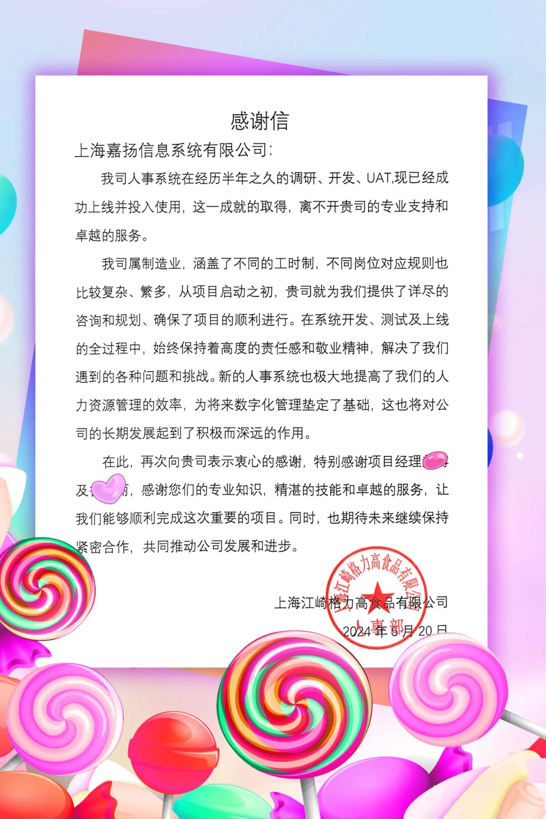 能够收到格力高的感谢信,嘉扬实施团队心中充满了欣喜与感恩,更多了一份使命感。未来,嘉扬实施团队将和售后团队一起,为格力高公司提供更加高效、稳定的人力资源管理系统服务,不断提升实施服务水平,快速满足灵活变化的业务需求,积极推动格力高实现数字化转型的蜕变升级。