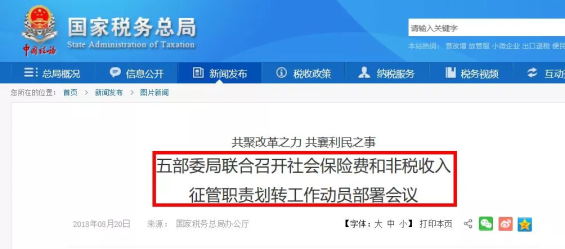 8月20日,国家税务总局、财政部、人力资源和社会保障部、国家卫生健康委员会、国家医疗保障局视频会议部署,今年12月10日前要完成社会保险费和第一批非税收入征管职责划转交接工作,自2019年1月1日起由税务部门统一征收各项社会保险费和先行划转的非税收入。