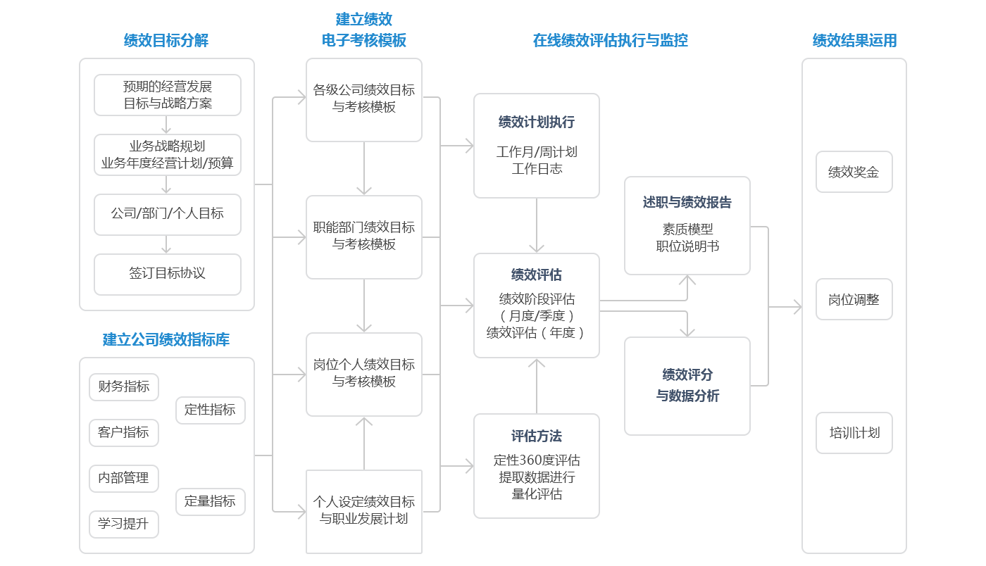 支持KPI、平衡计分卡、360度考评等多种考评工具的运用。