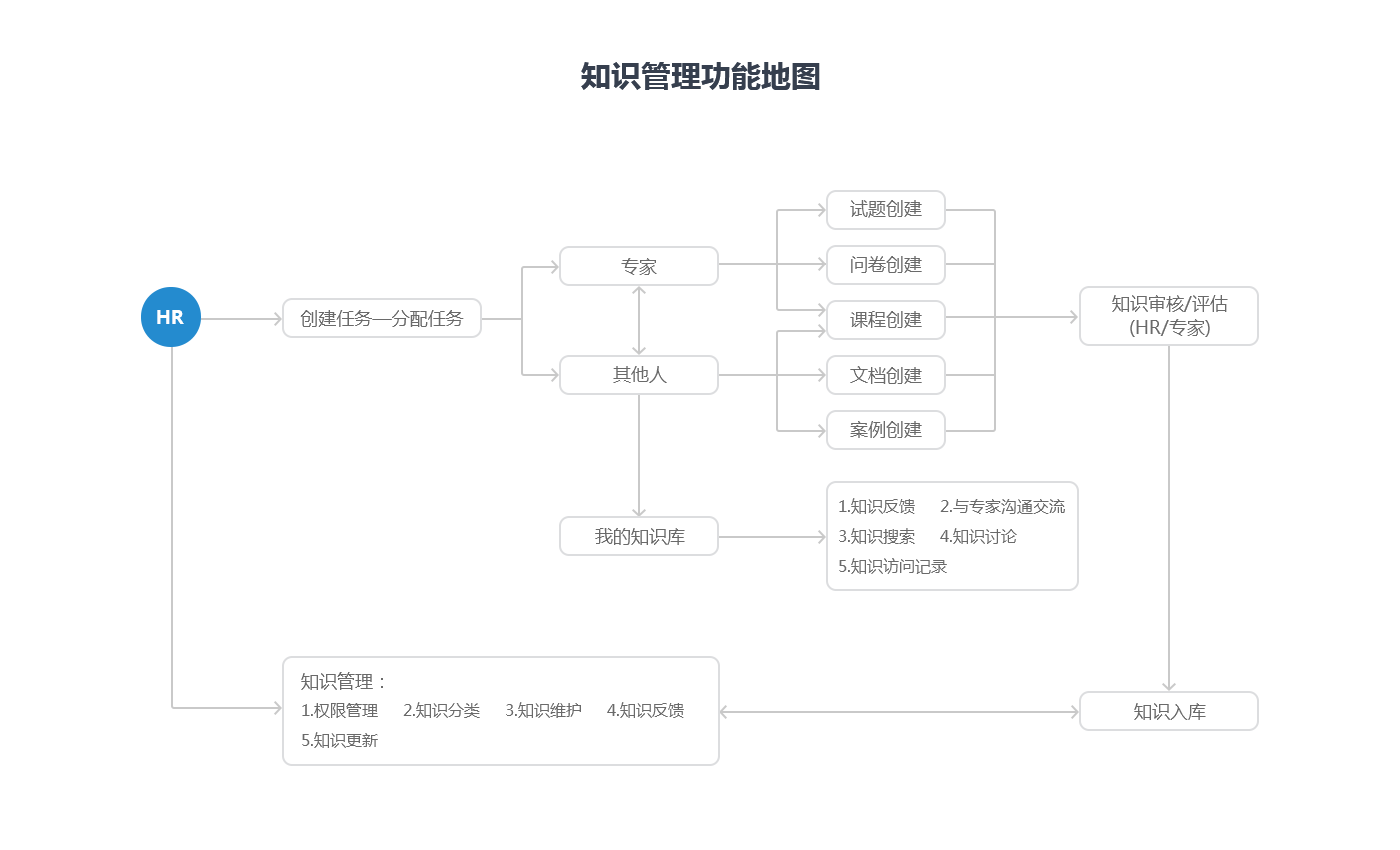 创建企业知识蓝图,构建企业知识仓库,包括:试题、课程、文档、案例、问卷等;